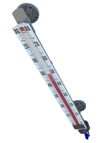 磁翻板液位計(jì)(也可稱為磁性浮子液位計(jì))根據(jù)浮力原理和磁性耦合作用研制而成。當(dāng)被測容器中的液位升降時(shí),液位計(jì)本體管中的磁性浮子也隨之升降,浮子內(nèi)的永久磁鋼通過磁耦合傳遞到磁翻柱指示器,驅(qū)動(dòng)紅、白翻柱翻轉(zhuǎn)180°,當(dāng)液位上升時(shí)翻柱由白色轉(zhuǎn)變?yōu)榧t色,當(dāng)液位下降時(shí)翻柱由紅色轉(zhuǎn)變?yōu)榘咨?/p>